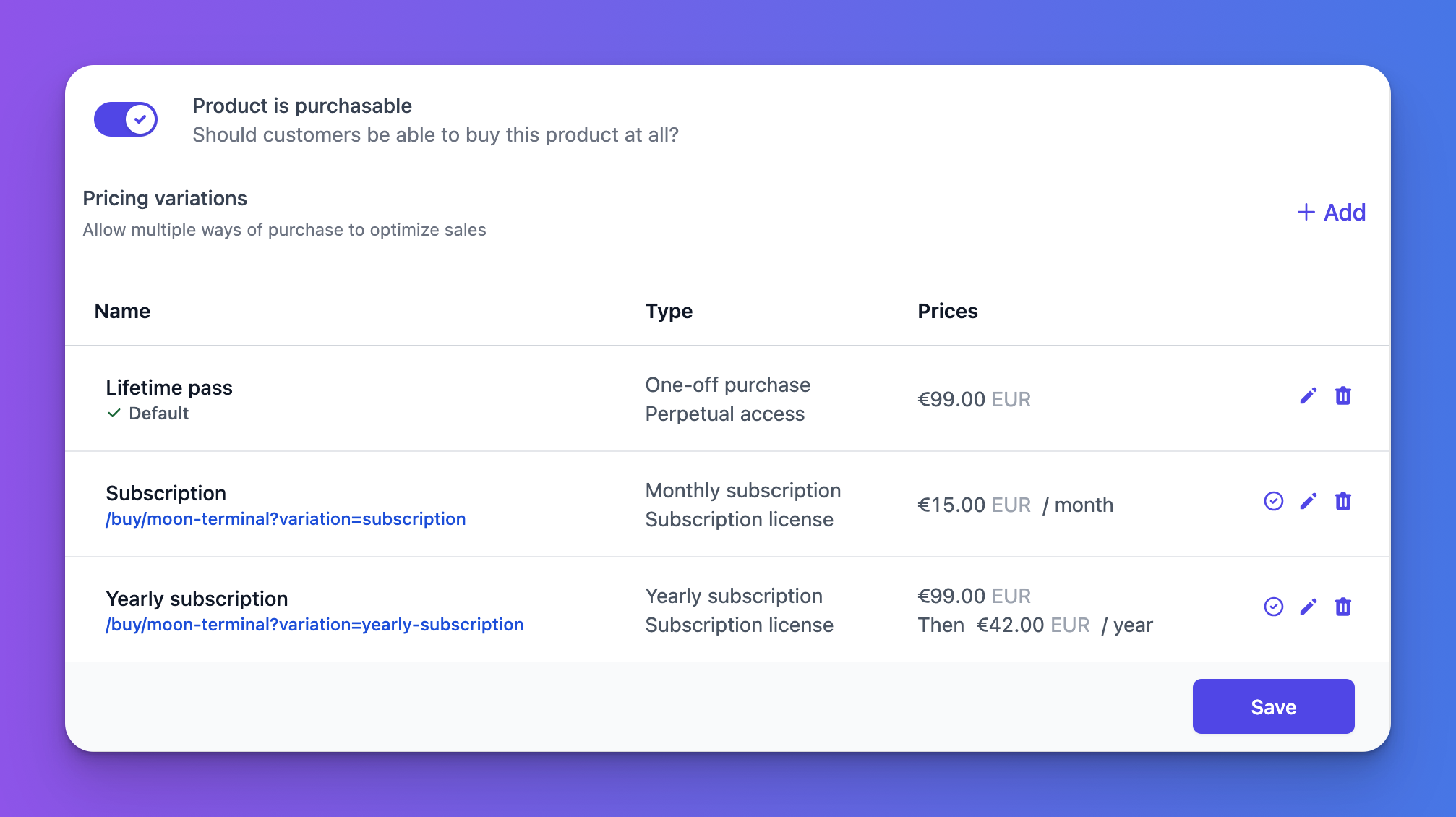 When you sell products or bundles through Moonbase, they are always sold as a variation of the base product or bundle, and you can have as many variations as you need. These different variations can be a mix between one-off payments for perpetual licenses, or recurring subscription payments. You could also have different variations with different licensing entitlements, to be able to sell more premium packages of the same product: