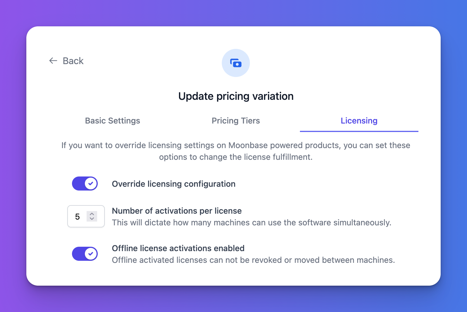 These overrides can adjust the number of seats on licenses created by purchases of this variation, as well as the eligibility of offline activations. Note that these settings are only applicable if you are using Moonbase for your licensing solution.