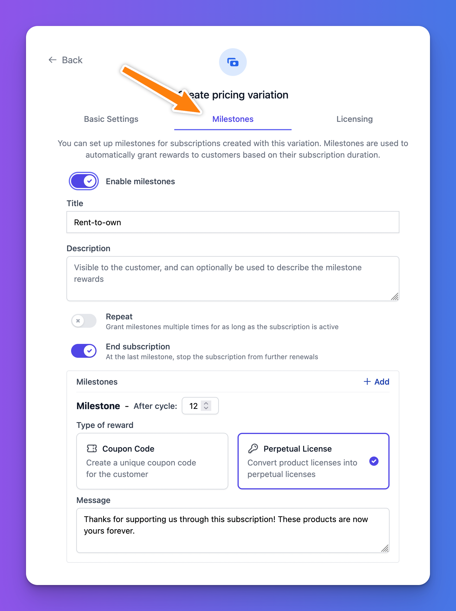 You also have the option to keep the milestones repeating indefinitely, so long as the subscription is active, or to end the subscription once the last milestone is reached.