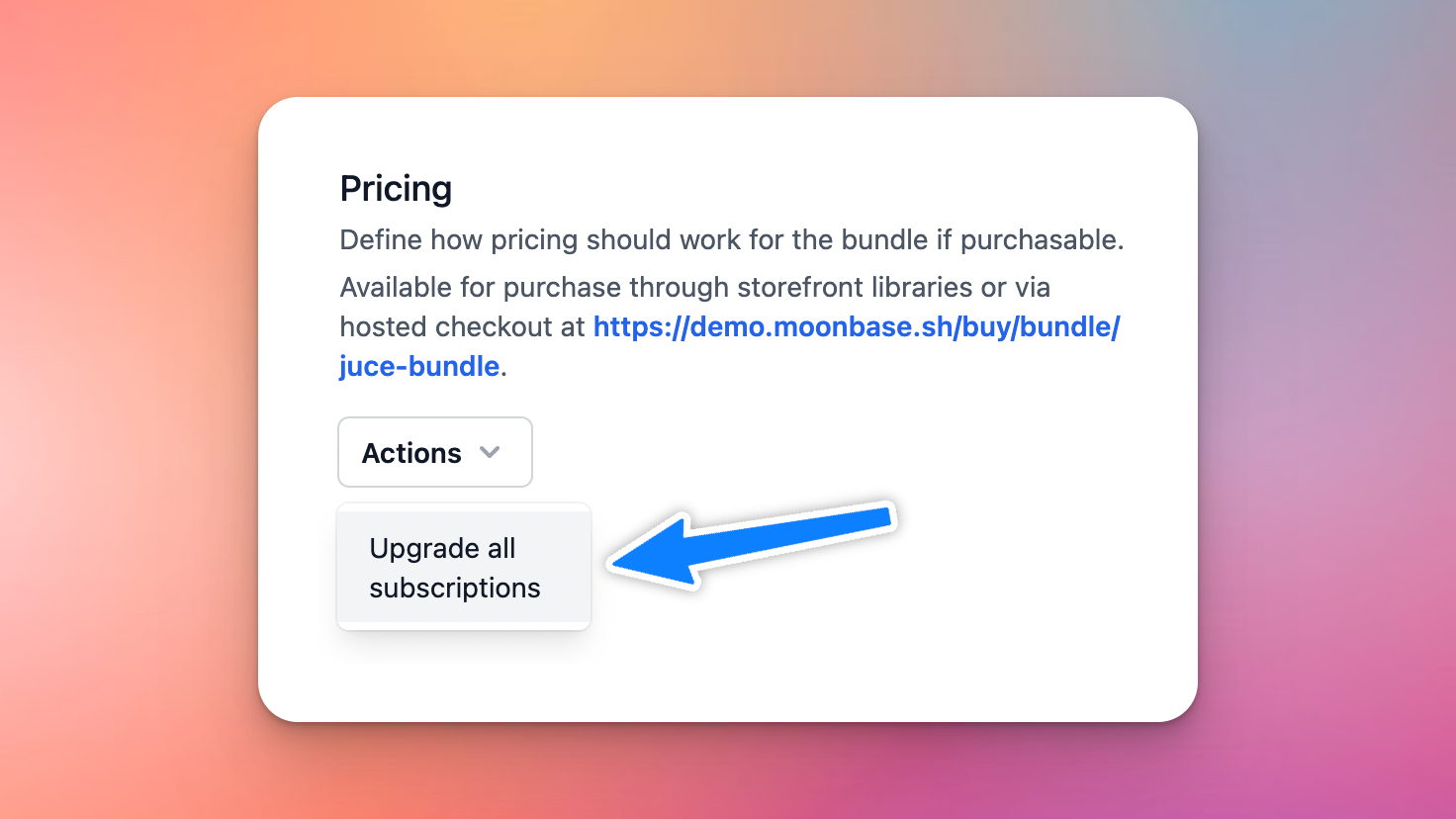 Like most of the pricing tools we have in Moonbase, subscriptions also works for selling bundles. Whenever customers start a subscription to a bundle, they receive licenses for all products within the bundle, attached to the bundle subscription itself. Like with one-off perpetual sales, partial bundle purchases also works when starting subscriptions, allowing customers to get a reduced price for a smaller bundle.