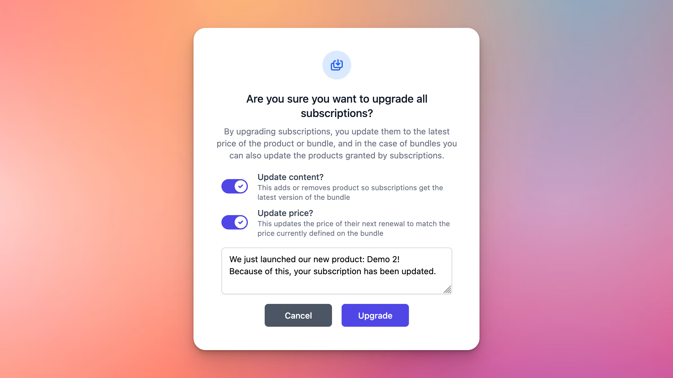 Over time you may change the bundle however, and it’s important to consider existing subscriber when you make these changes. When you add products or change the price, existing subscriptions are never impacted. You have to do this explicitly through subscription upgrades. These upgrades can be performed on individual subscriptions, but you can also initiate upgrades for all subscriptions for a given bundle: